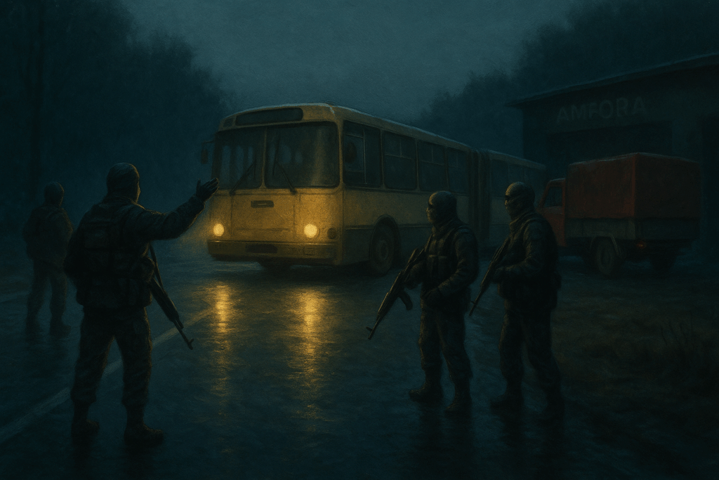 Milan čizmama kroči u autobus. Od šofera zahtijeva gašenje motora. Vozač to nevoljno čini, a glavnokomandujući traži lične karte na pregled. Koračanje kroz vozilo traje nekoliko minuta. Na srednjim i zadnjim vratima nekoliko je Osvetnika s puškama.